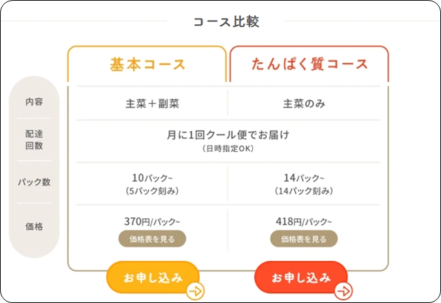 まとめて購入するパック数が多いほど1パック当たりは安くなりますが、まずはお試し感覚で、基本コースなら10パックセット、たんぱく質コースなら14パックセットを注文するのが良いでしょう。